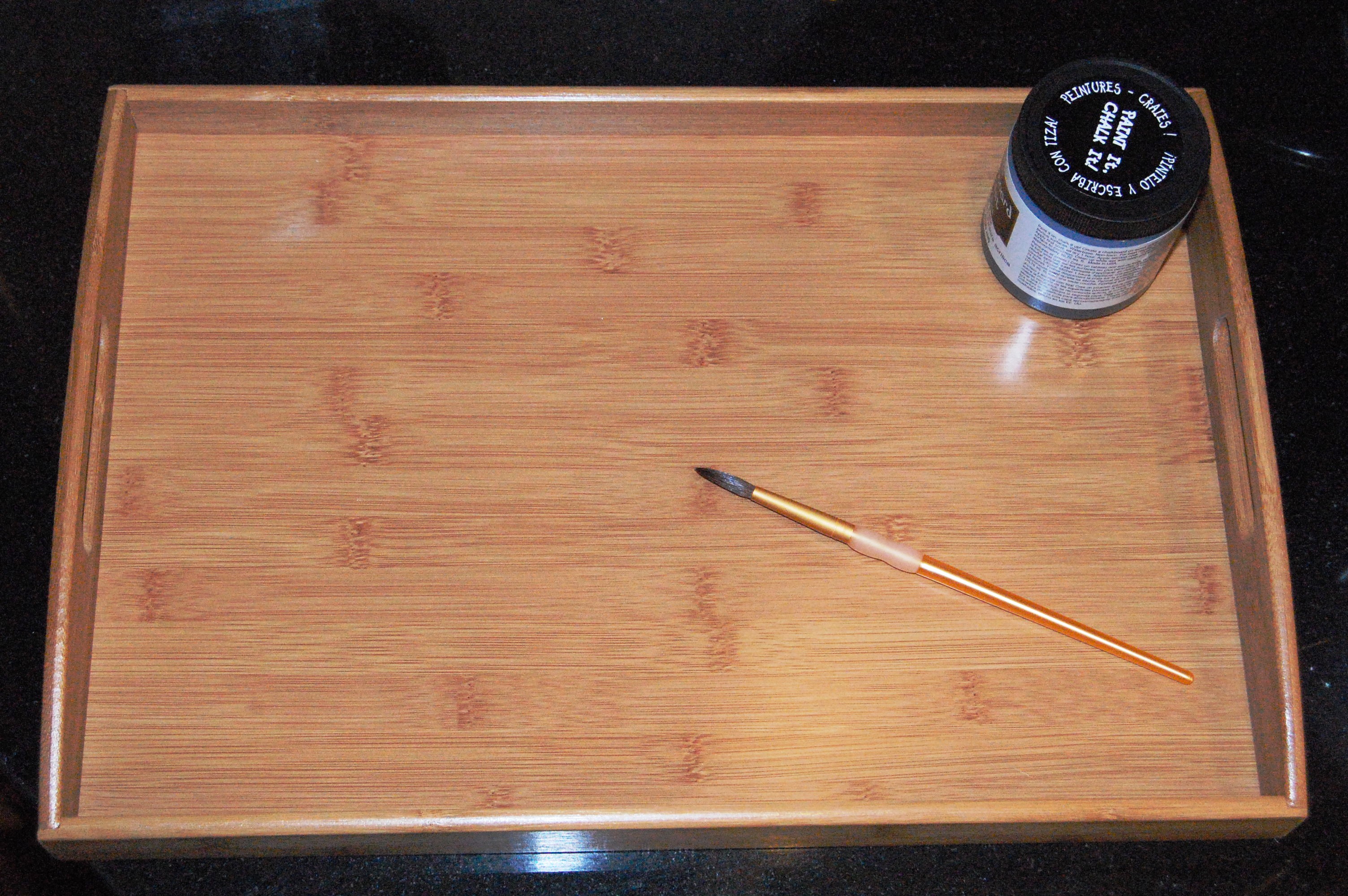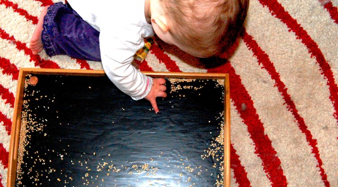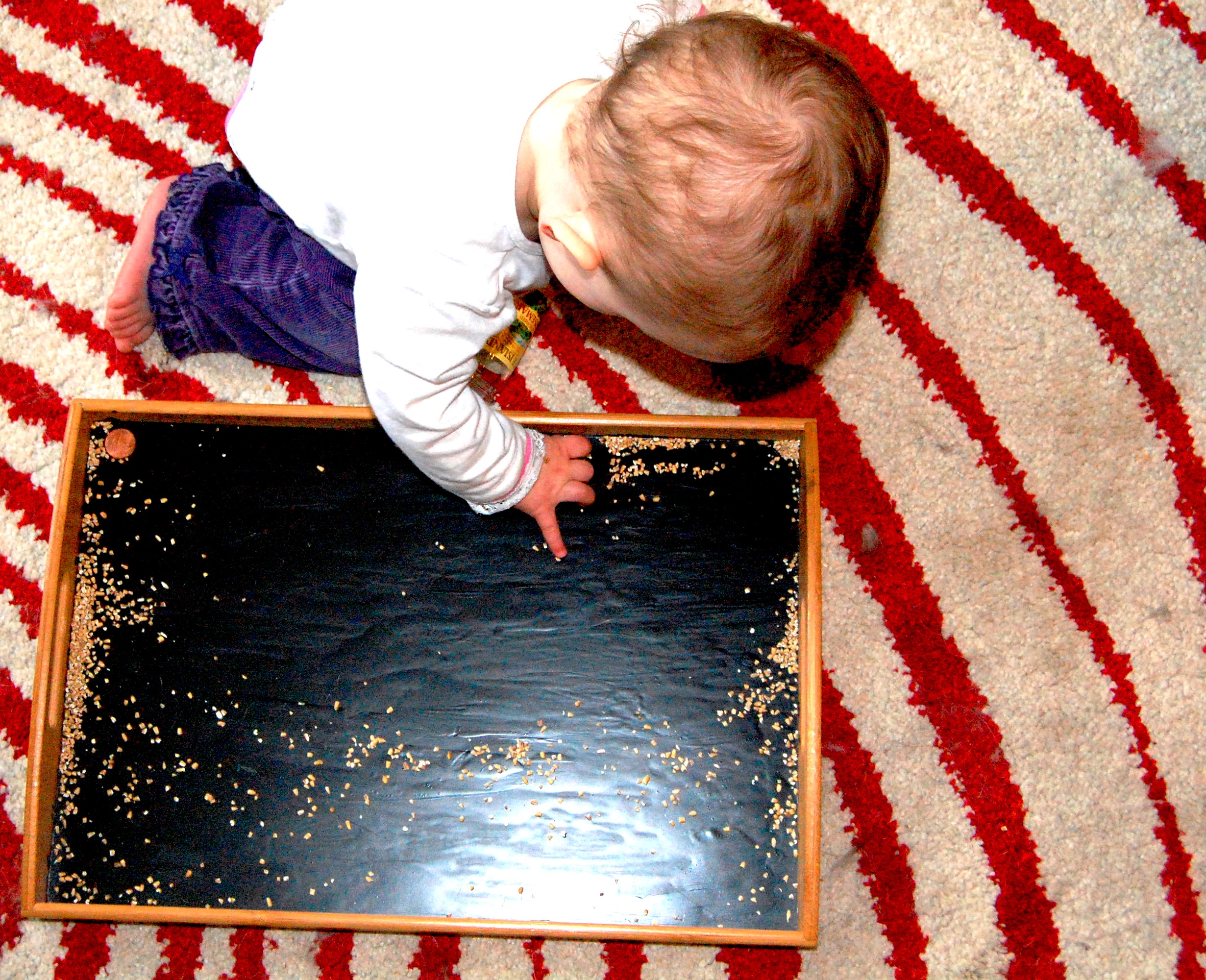 As I began painting, I started thinking of a DIY chalkboard paint cheese plate article George had shared with me (http://witandwhistle.com/2011/12/21/diy-chalkboard-serving-platter). What a great Valentine’s Day surprise! Cheese, wine — awesome idea!! As my excitement mounted, so did the lumps and stray paint marks. My short lived elation and perfectionism sort of collided with reality and patience: no cheese plate here. The end product in actual Pinterest execution is lumpy, not neat and DEFINITELY for child’s play. (Sigh) So I grabbed a tablespoon or two of steel cut oats and Sweetpea went to town.